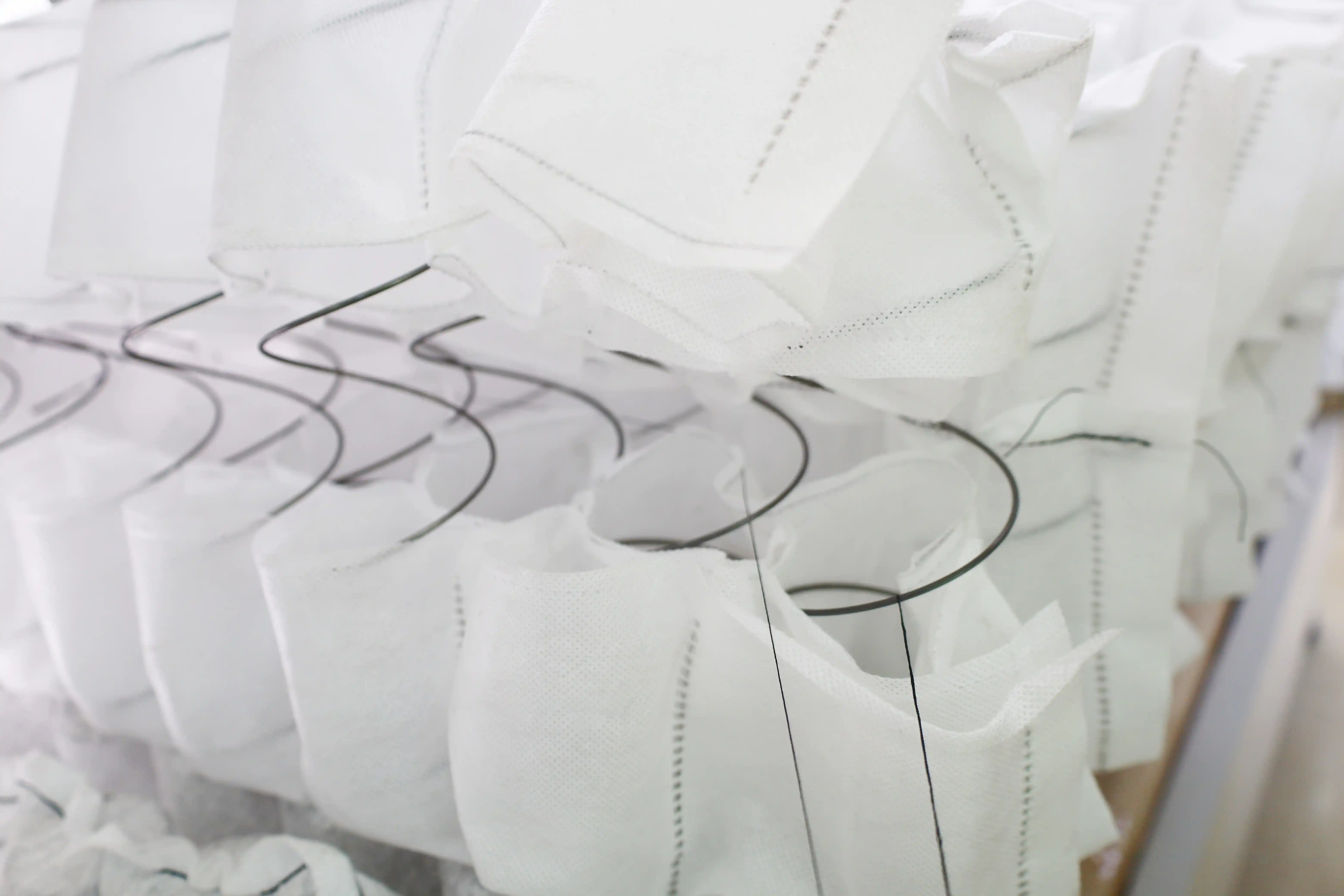 传统袋装弹簧的生产通常采用超声波焊接(Ultrasonic Welding),这种方式虽然高效,但会让布袋与弹簧紧密粘合,难以分离。而联柔机械通过自主研发的可缝纫袋装弹簧生产线,实现了无焊接、无胶水、无异味的组装方式。这种创新带来了三大突破: